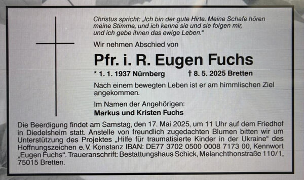 wir haben uns heute versammelt, um Abschied zu nehmen von Eugen Fuchs – einem geistlichen Mann, einem treuen Diener Gottes und einem großen Freund der CVJM-Arbeit.