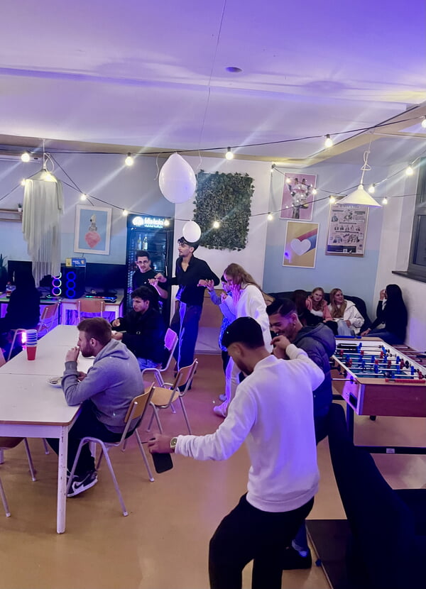 Im Café Mint selbst haben wir mit Lichterketten, bunten Strahlern und Schwarzlicht eine besondere Stimmung geschaffen. Auf der Mint Stage unten wurde mit leuchtenden Tischtennisbällen gespielt.  Im Café Mint wurde wild und außegelassen getanzt.