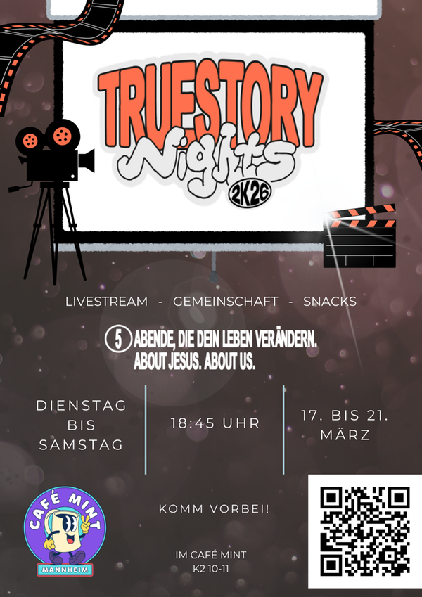 Am Dienstag, den 17. März beginnen wir mit TRUESTORY. An fünf aufeinanderfolgenden Abenden werden wir um 19:00 Uhr im Café Mint einen Livestream anschauen. Bei TRUESTORY werden verschiedene Menschen ihr Zeugnis teilen, was sie mit Gott erlebt haben oder wie sie zum Glauben gekommen sind. Jeden Abend gibt es ein anderes Thema, angefangen mit "Geliebt statt Perfekt" am ersten Abend und "Leben ohne Ende" am letzten Abend.